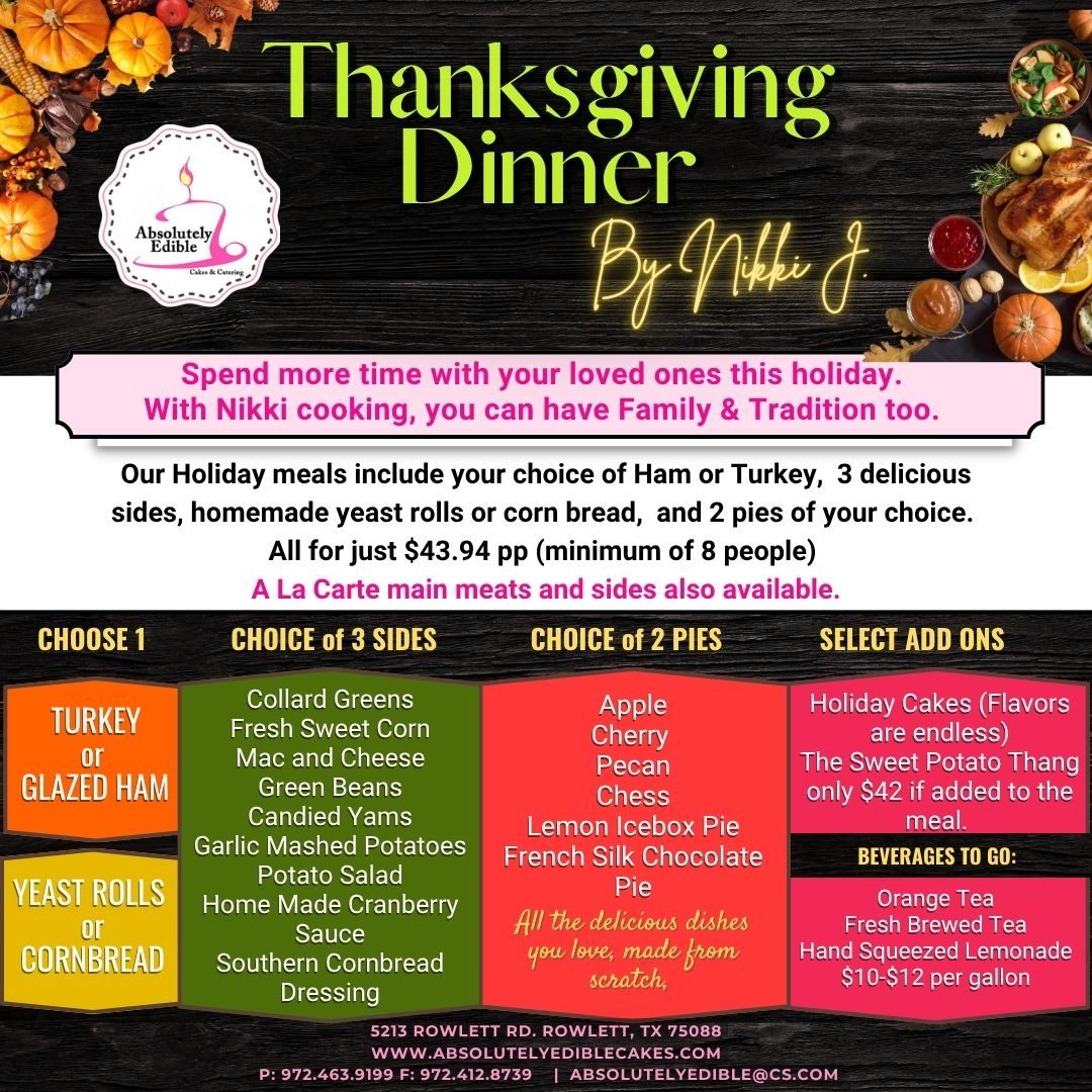 Add holiday cakes and the Sweet Potato Thang ($42 special price for full dinner). Beverages to go available.