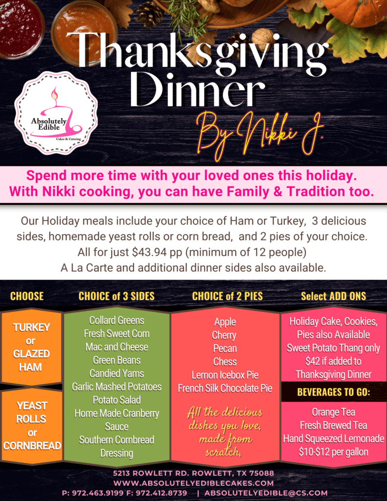 This Thanksgiving, show your loved ones how much you care with a homemade holiday meal from Absolutely Edible Cakes. Chef Nikki’s signature Southern-style home cooking is made with love, using the same comforting flavors that have made her desserts and dinners a local favorite.
