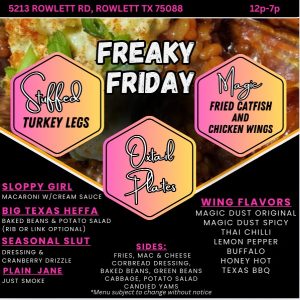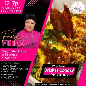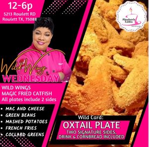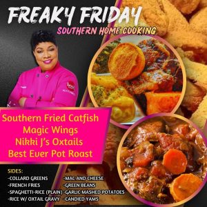 This year we are growing our Lunch and Dinner take out menu. Each Wednesday and Friday Nikki is opening the Catering Kitchen for delicious dinners such as Magic Chicken Wings and Catfish. Wild Cards are added on Fridays. Most Sundays of the Month are Soul Food Sundays. Be sure to check back each week to see what Nikki has on the menu! Sides and Mains subject to change and availability.
